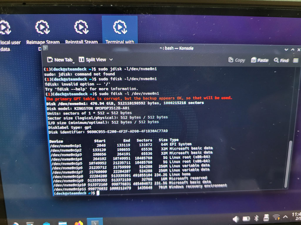 2025 年 2 月 8 日 其他維修 使用外置recover steam os boot up. Konsole lsblk Next restore missing partition. sudo fdisk -l /dev/nvme0n1 (list system)sudo fdisk /dev/nvme0n1 (recover system)pw lsblk 正常了poweroff 下一步是boot from file. steamos.efi 回到原系統中 未設定好password 先用passwd sudo efibootmgr -c -d /dec/nvme0n1 -p 1 -L “steamOS” -l “EFI\steamos\steamcl.efi” Author: lemoncall 電子維修