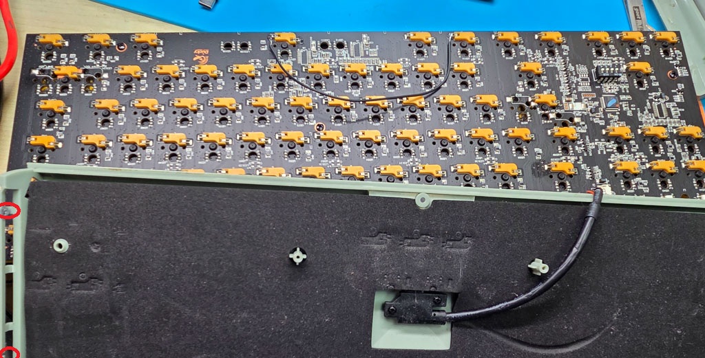 2025 年 12 月 16 日 鍵盤 Ducky one repair Ducky One 87 鍵盤這把鍵盤最下排的按鍵沒有反應,基本上可以確定是主板斷線造成的。 這款鍵盤左右兩側都有側板,需要先拆除。 負極斷路,需要飛線,已完成。 Author: lemoncall 電子維修
